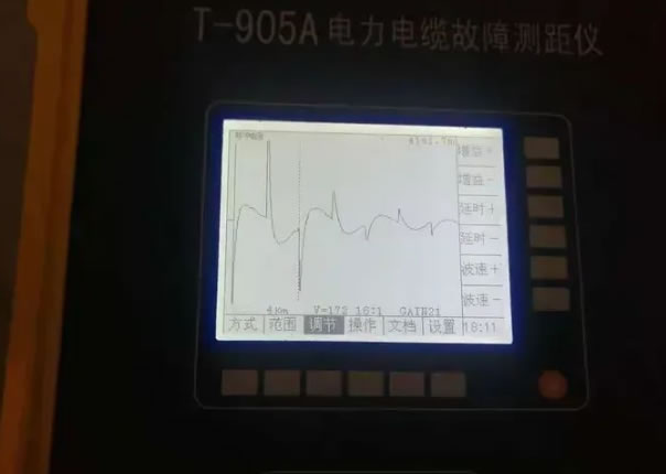 與外破型高阻故障相比,這種故障在進(jìn)行高壓脈沖擊穿測(cè)試時(shí)的放電形式明顯不同。外破型故障放電主要發(fā)生在電纜本體或接頭線芯與故障點(diǎn)相連的鋼鎧上,呈縱向垂直放電。與之相反,泄露性高阻故障的放電特點(diǎn)是不同的。通過(guò)反射脈沖波形的清晰度和測(cè)距的準(zhǔn)確性,可以清晰地判斷故障點(diǎn)放電的位置,并且故障點(diǎn)放電的聲音干脆清晰,有利于快速準(zhǔn)確定位故障點(diǎn)。